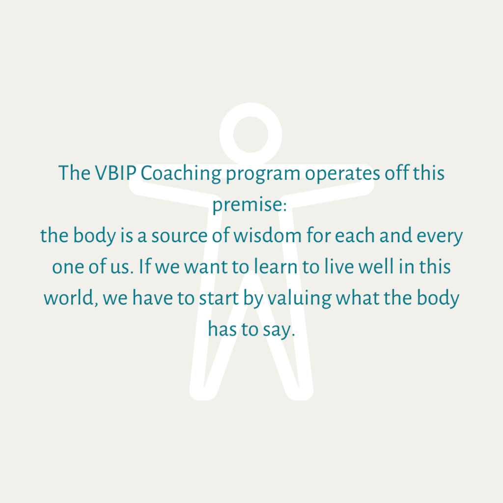 The VBIP coaching program operates off this premise: the body is a source of wisdom for each and every one of us. If we want to learn to live well in this world, we have to start by valuing what the body has to say.